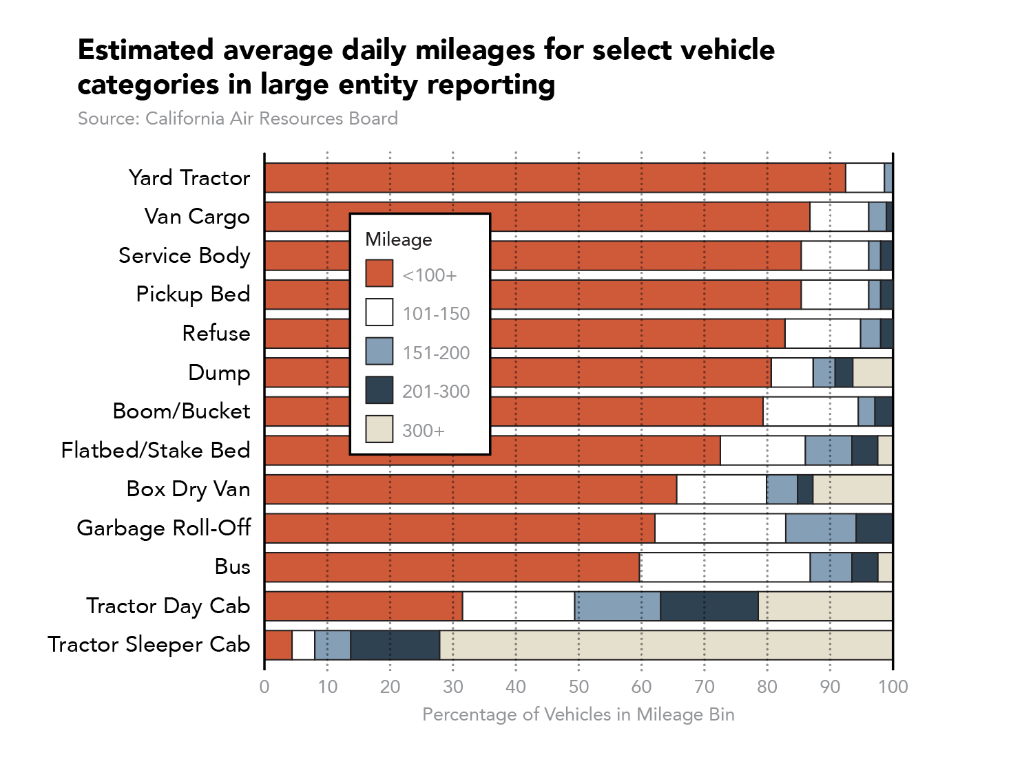 Data in California shows that more than 50% of commercial vehicles operate within 50 miles of their home base.